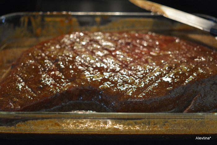Кусок говядины комнатной температуры слегка порезать острым ножом, сеткой с 2х сторон. Залить маринадом. Закрыть пленкой и мариновать 2 часа в холодильнике, раз перевернув через час.