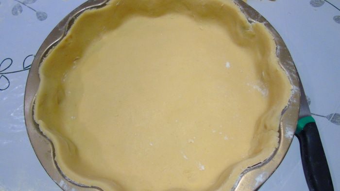 Тесто раскатываем и выкладываем в форму, лишнее обрезаем, накалываем вилкой и отправляем еще в холодильник на 30 минут.