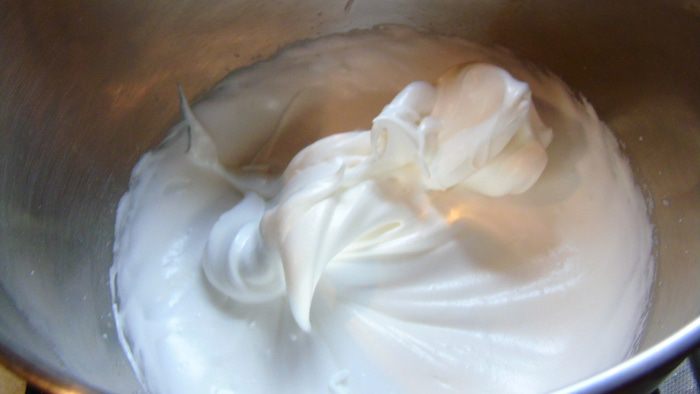 Белки взбиваем с оставшимся сахаром до мягких пик.