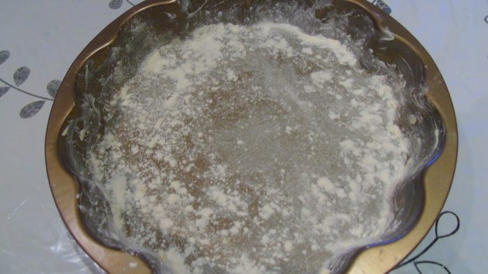 Форму смазываем маслом и присыпаем мукой.
