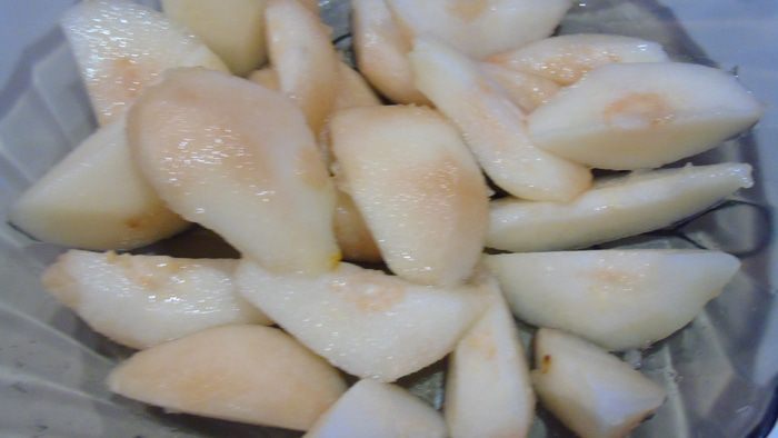 Груши очищаем и нарезаем, поливаем лимонным соком.