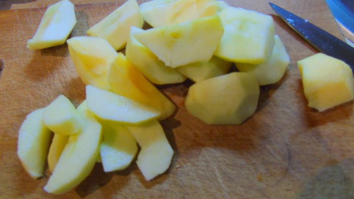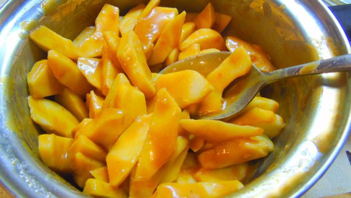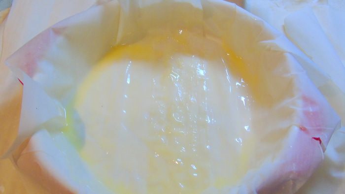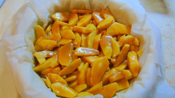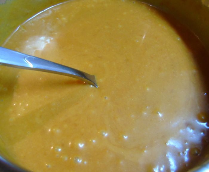 Приготовим карамель. Для этого в кастрюле с толстым дном смешиваем сахар, сливки и сливочное масло. Доводим до кипения, все время помешивая, и варим до того, как масса чуть загустеет и станет коричневого цвета. Даем остыть. У меня карамель, которая осталась от торта, ее я готовила немного по другому: сахар 225 г расплавила полностью на сковороде, затем по маленькому кусочку добавляла сливочное масло (100 г), кусочек за кусочком, каждый раз перемешивая до растворения, затем влила теплые сливки (180 мл), перемешала и сняла с огня.