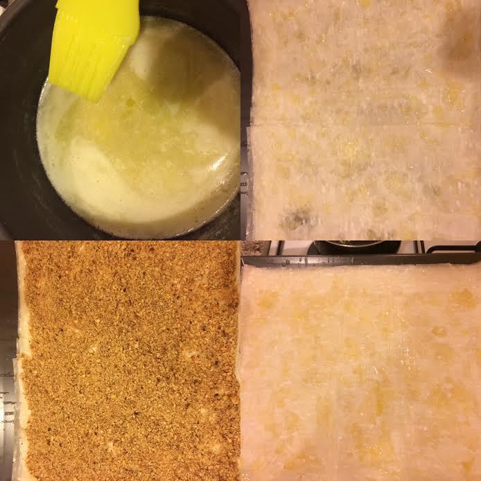Растопить сливочное масло. Теперь самое главное и самое длительное — сборка. Противень 43*36 см слегка сбрызнуть маслом. Духовку нагреть до 180°С. У меня в пачке 28 листов теста. Я выкладываю 10 листов, затем кладу начинку, потом опять 10 листов, потом опять начинка и потом остальные 8 листов. Каждый лист теста нужно сбрызнуть маслом и только потом класть сверху второй лист.