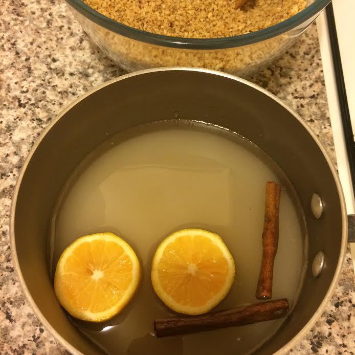 Сначала готовим сироп. В кастрюле смешиваем воду, сахар, лимон и корицу. Ставим на медленный огонь, помешивая, доводим до кипения, даем еще покипеть минут 5 и снимаем с огня. Сироп готов.