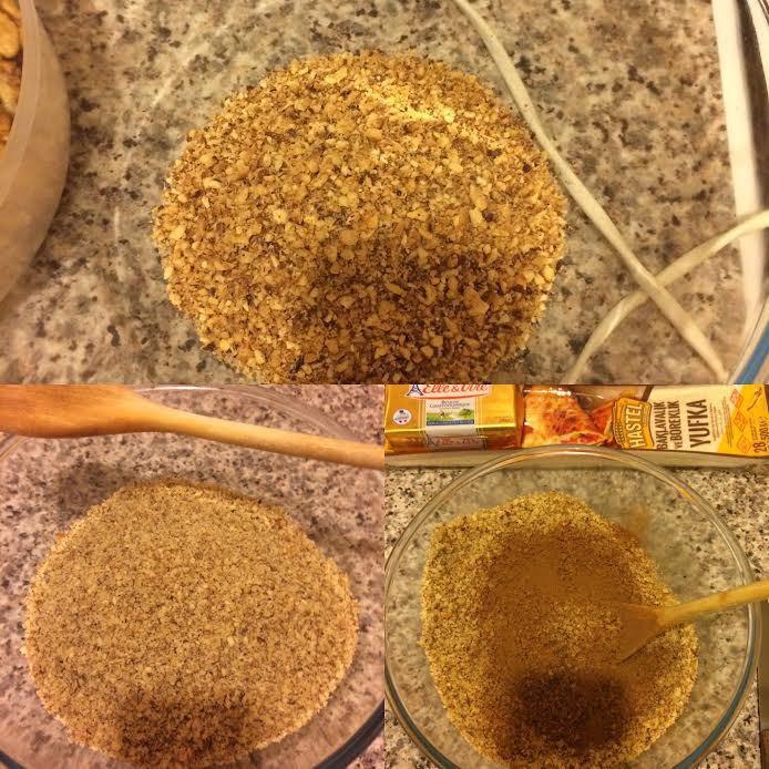 Фундук и миндаль прокалить на сковороде. Остудить и очистить. Затем измельчить орехи (миндаль, фундук, грецкий орех) в блендере, но не сильно. В орехи добавить корицу и гвоздику, перемешать. Начинка готова.