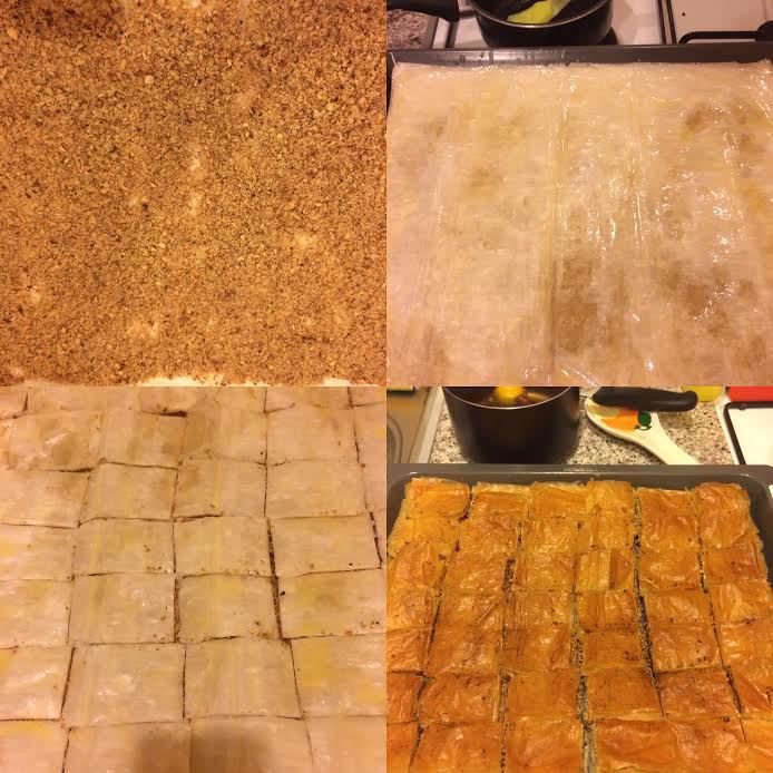 Последний лист теста смазываем хорошо маслом и ставим форму с баклавой в холодильник на 15 минут. Затем достаем баклаву из холодильника и нарезаем на нужные нам куски. Отправлям баклаву в духовку на 1 час или на час и 15 минут. Затем достаем готовую баклаву и сразу же поливаем остывшим сиропом. Сироп должен попасть во все разрезы и хорошо пропитать баклаву.