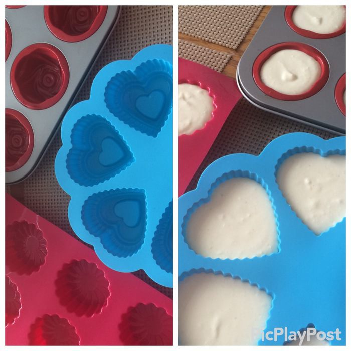 Ложкой аккуратно выкладываем в формочки тесто. У меня теста хватило ровно на 3 формы по 6 штучек.