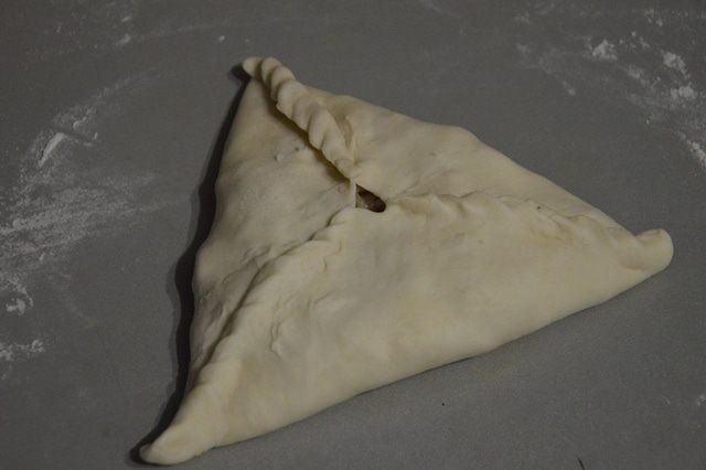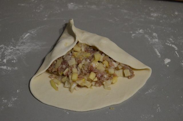 Преступаем к формированию треугольников. Отщипываем кусочек теста и раскатываем в лепешку и на середину выкладываем начинку и соединяем формируя 1й угол.