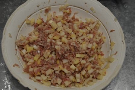 А пока займемся начинкой. Картошку и лук чистим и мелко нарезаем кубиками. Все смешиваем с фаршем (обычно мясо так же мелко нарезается, но у меня нет времени). Солим перчим по вкусу.