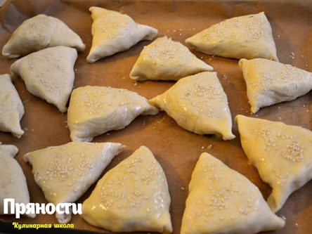 Выкладываем на противень, смазываем яйцом и посыпаем кунжутом (по желанию). Ставим в разогретую духовку при 160-170°С на 30-45 минут.