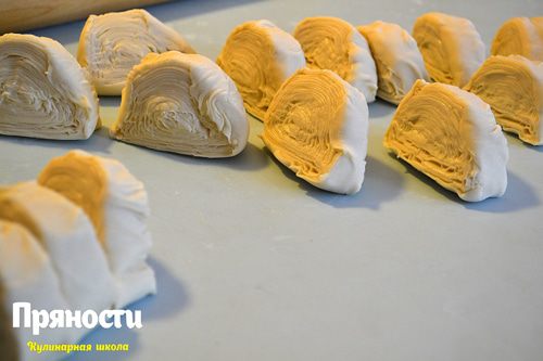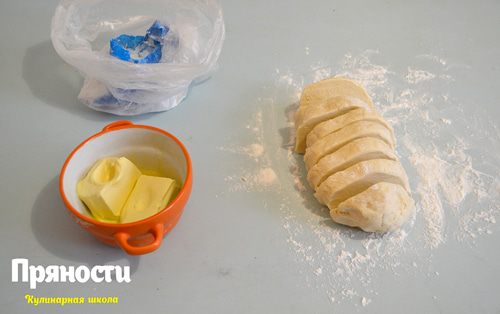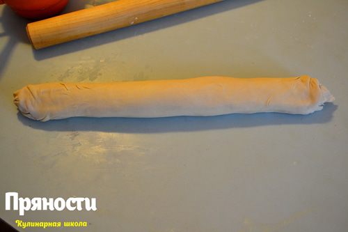 Снова получаем плотный рулет, только уже из двух кусочков и так поступаем со всеми кусочками теста.