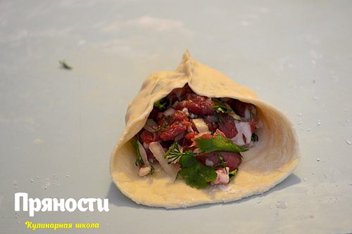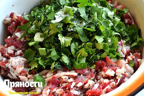Для начинки мясо порезать мелкими кусочками — не ленитесь, не используйте мясорубку. Лук, сало и зелень так же мелко порезать. Добавить соль, перец, зиру и все хорошо перемешать.