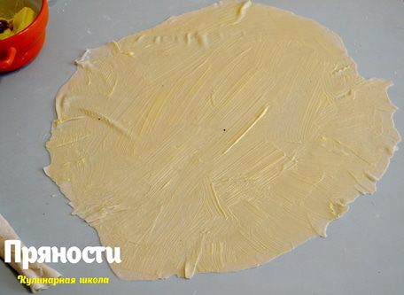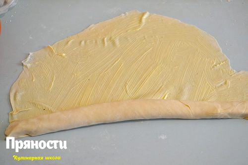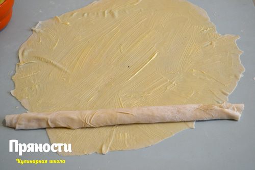Раскатанный слой смазываем размягченным сливочным маслом или маргарином. Я делала и с тем и с другим, вкусно одинаково, так что можете смело использовать маргарин. Сворачиваем наш пласт в плотный рулет и убираем в сторонку.
