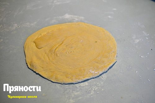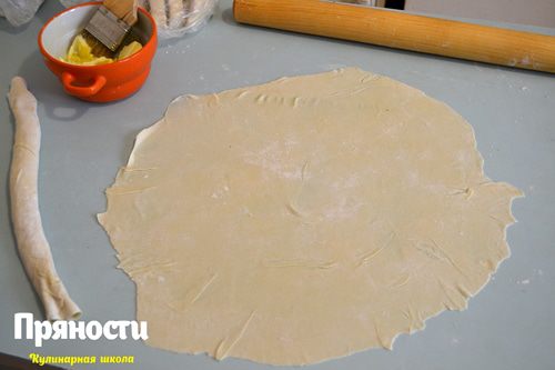 Раскатываем каждый кусочек в круг, начиная от середины к краям, чтобы краешки стали тонкими, а середина осталась плотной.