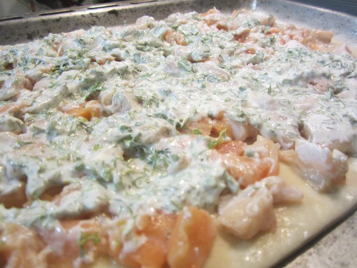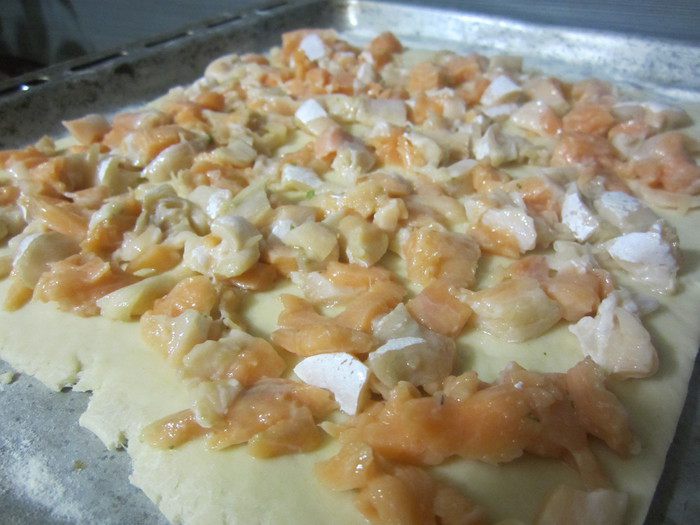 Тесто раскатать. Выложить на него равномерно рыбу, по желанию посолить.
