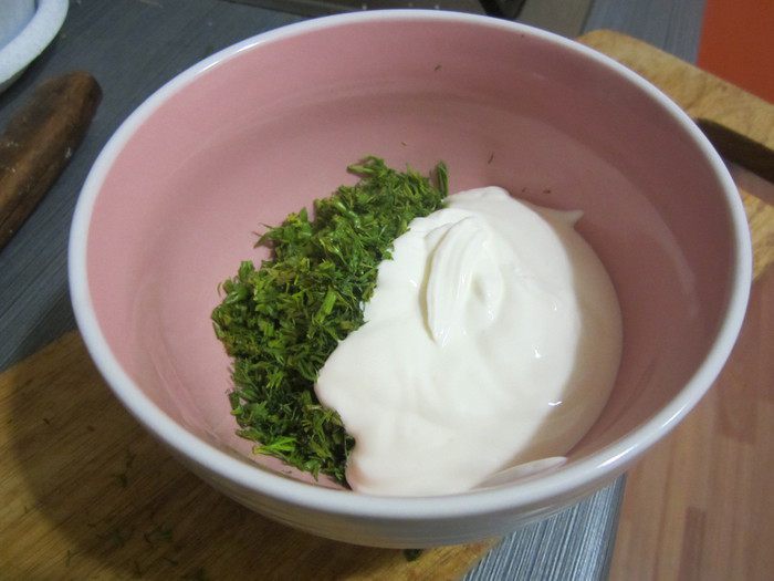 Рубленую зелень укропа соединить со сметаной, перемешать. Посолить, поперчить по вкусу.