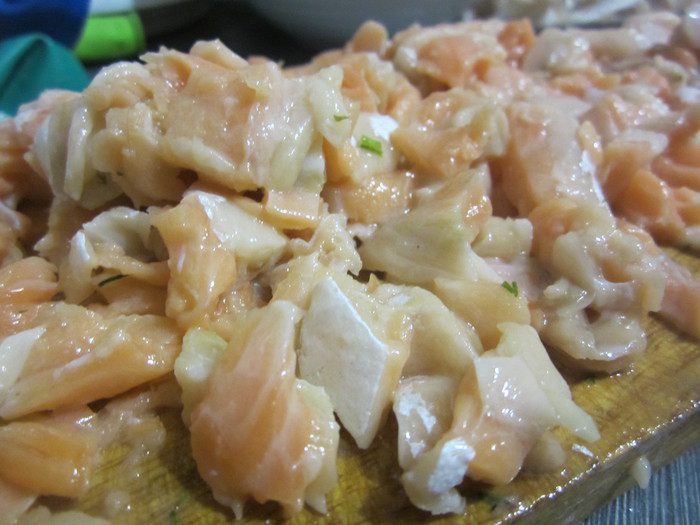Сёмгу промыть, отделить от кожи, порезать на кусочки.