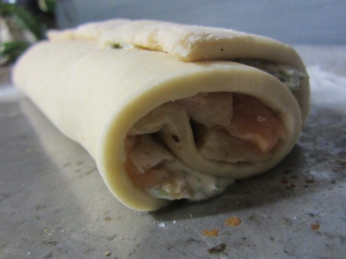 Свернуть в рулет. Яйцом смазать верх рулета. Выложить в форму. Отправить в предварительно разогретую духовку. Выпекать 30 минут при 200°С.