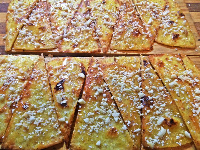 Смазываем мёдом каждый треугольник. Для слоёного теста: смазать и посыпать орешками перед выпечкой!