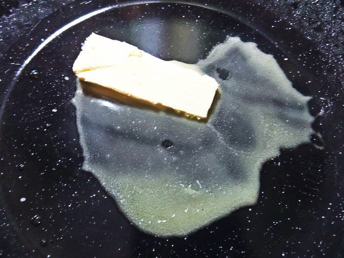 Растопить кусочек сливочного масла в сковороде с толстым дном. У меня чугунная.