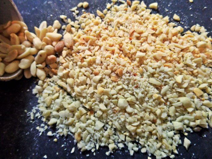 Арахис (у меня обжаренный) порубить в крошку. Удобно это сделать заранее, держать в баночке и брать по мере необходимости для десертов выпечки.