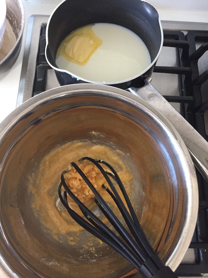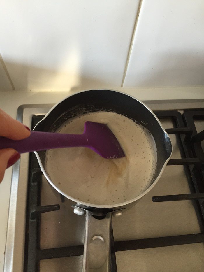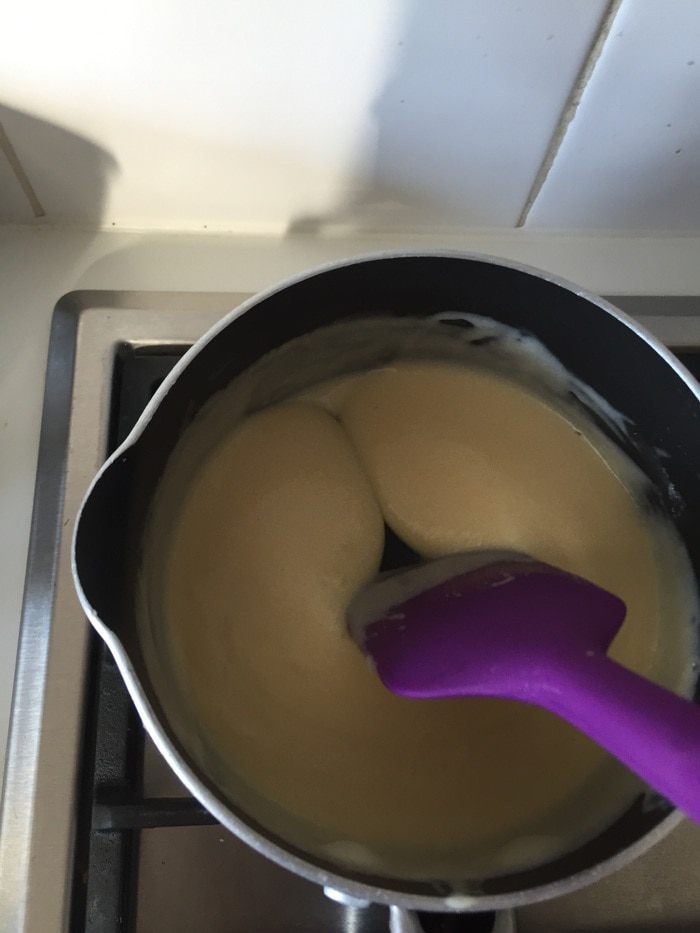 И так, варю крем привычным для себя способом: молоко нагреваю с маслом почти до кипения. В отдельной миске перетираю сахар с желтком, добавляю ванильную эссенцию, потом муку, хорошо перемешиваю.