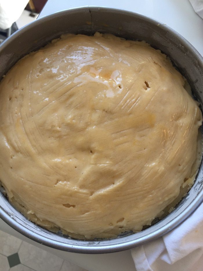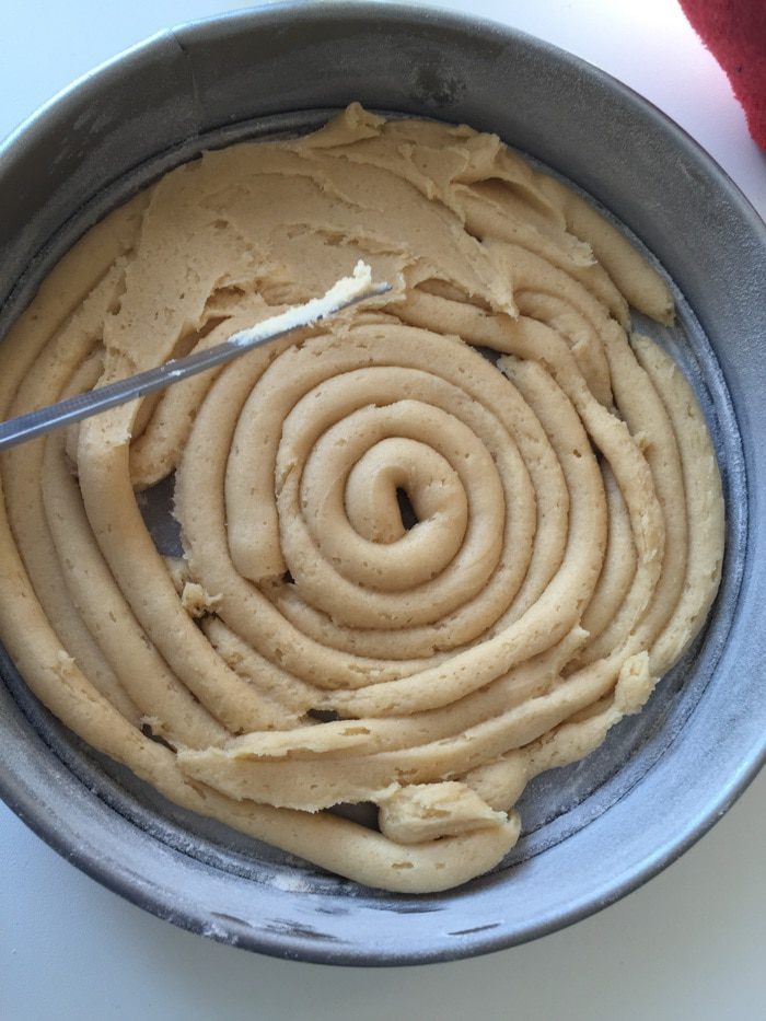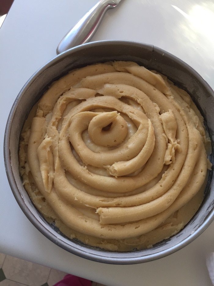 "Выжимаем" тесто (половину) по спирали в форму. Оно достаточно густое, надо поднапрячься. Смоченным водой ножичком, выравниваем наше тесто.