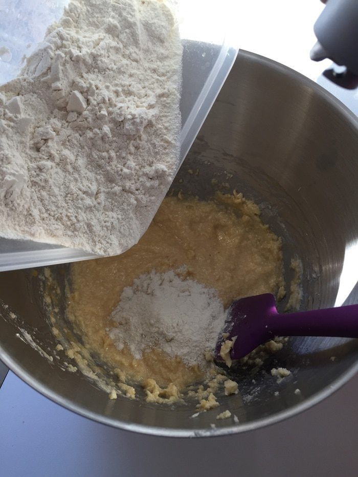 Потом просеянную с разрыхлителем и солью муку. Уже все мешаем спатулой.