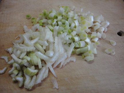 Белую часть лука нарезать колечками, также нарезать сельдерей и слегка обжарить на двух ложках растительного масла.