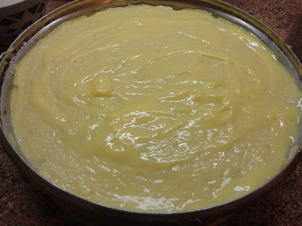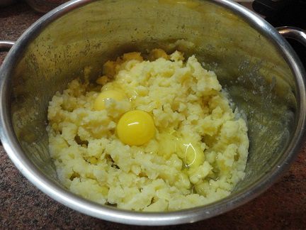 К этому времени картофель уже будет готов. Слейте воду, разомните, добавьте 70 г сливочного масла и 2 яйца и один белок (желток и 30 г сливочного масла оставим для смазка пирога), а также муку и замесите негустое "тесто".