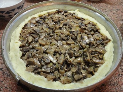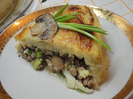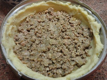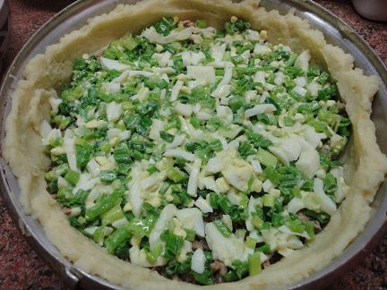 Накрыть оставшимся картофельным тестом. Я попробовала для смазки соединить растопленное сливочное масло с желтком. Получилось неплохо.