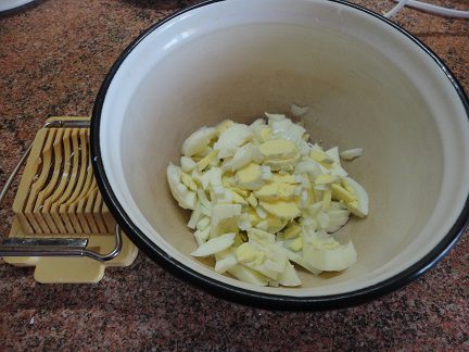 Картофель очистить и варить в подсоленной воде до готовности. За это время приготовим. Отварить 3 яйца вкрутую, очистить, нарезать кубиками. Я это делаю с помощью простого "гаджета" :)