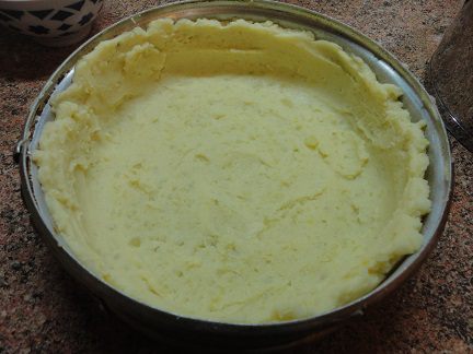 Форму для запекания (лучше разъемную) смазать маслом и выложить большей частью картофельного пюре, формируя бортики. Лучше это делать столовой ложкой, смоченной в воде.