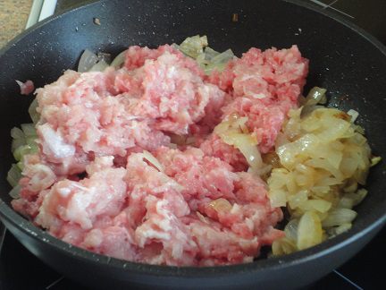 На другой сковороде обжарить до золотистого цвета мелко нарезанную одну луковицу и добавить к ней мясной фарш, перемешать, посолить, поперчить и потушить под крышкой минут 10.