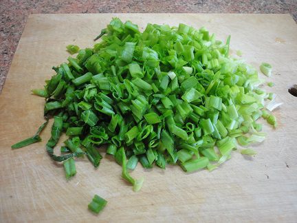 Зеленую часть лука нарезать колечками (белую оставим для грибов).