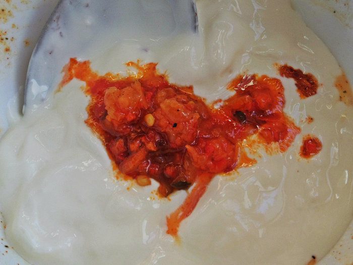 Ставим в духовку минут на 15-20 при 180°С, а пока делаем острую заливку — в ней весь смак, моим мужчинам здорово понравилось. Смешиваем сметану с домашней аджикой.