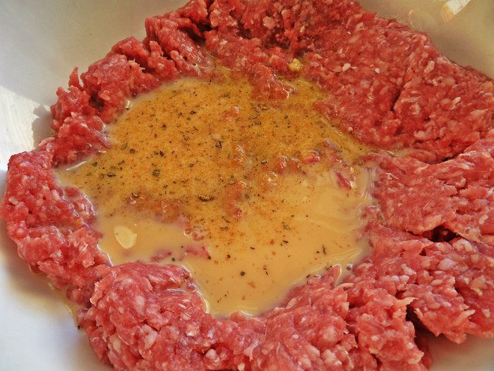 Взбить яйцо с приправами для фарша и солью и вылить в фарш.