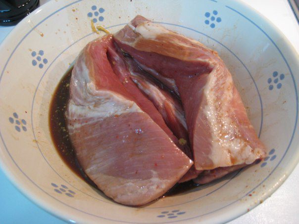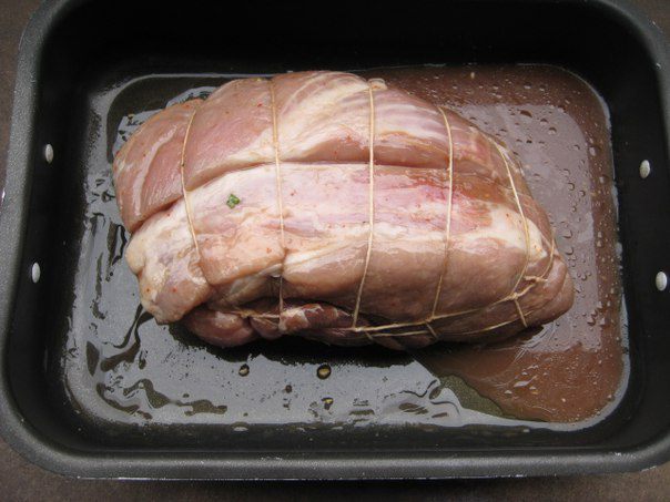 Форму смазать оливковым маслом, положить мясо, влить маринад. Накрыть фольгой, запекать при температуре 180°С 1,5 часа, затем снять фольгу и запекать еще минут 15 до румяного цвета.