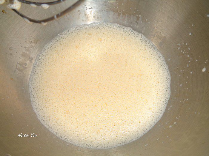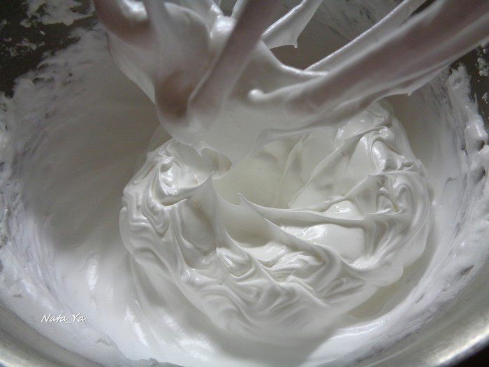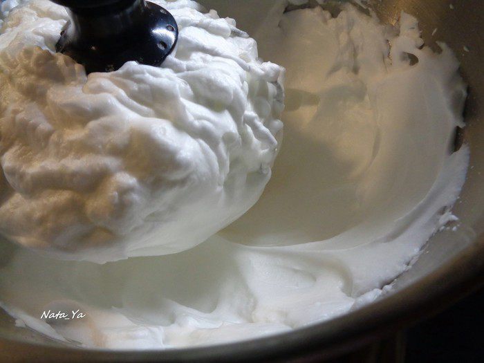 После того, как белки постояли ночь, можно заняться приготовлением коржей. Духовку разогреем до 170°С. Белки взобьем на средней скорости миксера до мягких пиков.