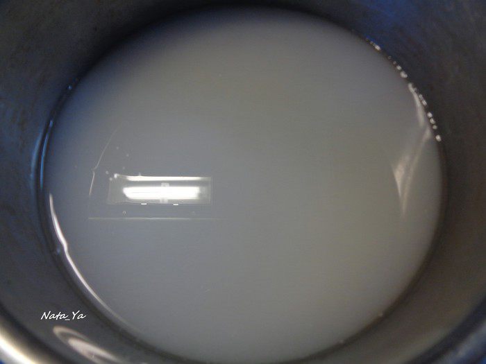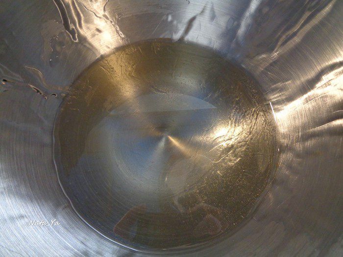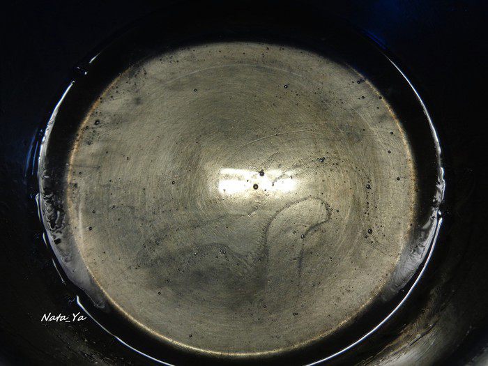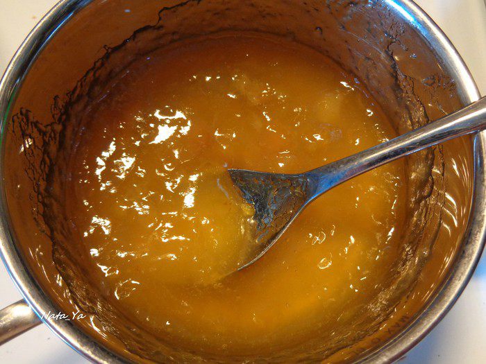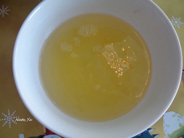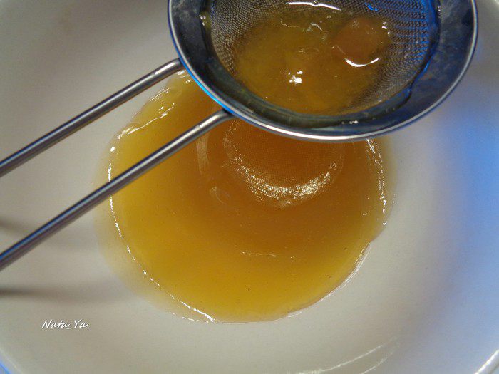Когда сироп остынет до примерно 40°С (около 15-20 минут), сольем воду. Это будет легко сделать, потому что сверху у нас будет слой воды, а под ним - сироп.
