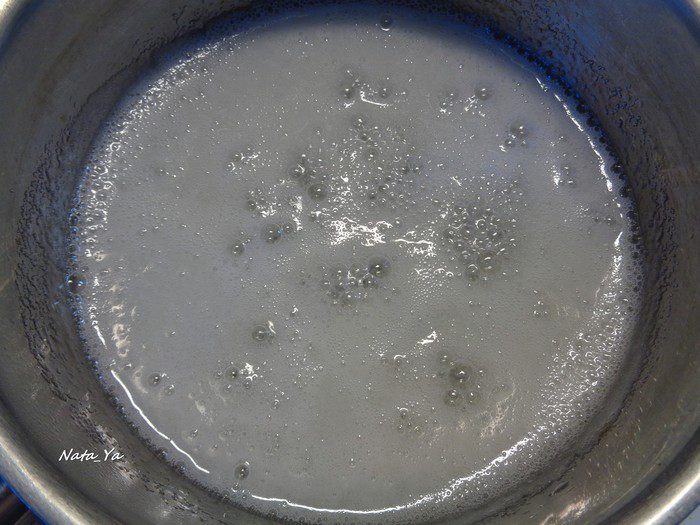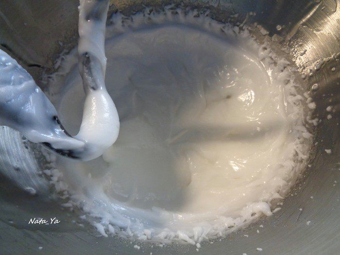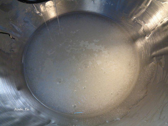 Вернем на сильный огонь, кипятим около 4-х минут. Сироп должен достигнуть температуры 115°С или пробы на мягкий шарик. Если нет термометра, то, начиная с третьей минуты кипячения, нужно пробовать сироп на шарик. Для этого сотейник нужно отставлять с огня, брать треть чайной ложки сиропа, опускать в ледяную воду. Если мягкий шарик удалось скатать, значит кипятить больше не стоит, если нет, вернуть на огонь еще на минуту. Опять попробовать.