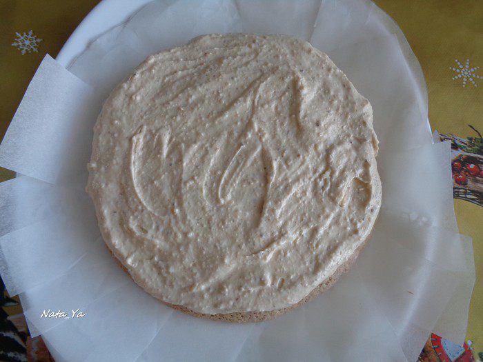 Сборка торта. Самый ровный и красивый корж отложить для верха торта. На плоское блюдо положить первый корж. Края коржа защитить нарезанной на кусочки пергаментной бумагой. Можно собирать торт также в разъемной форме.