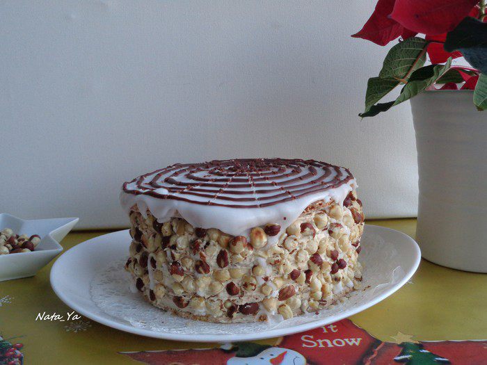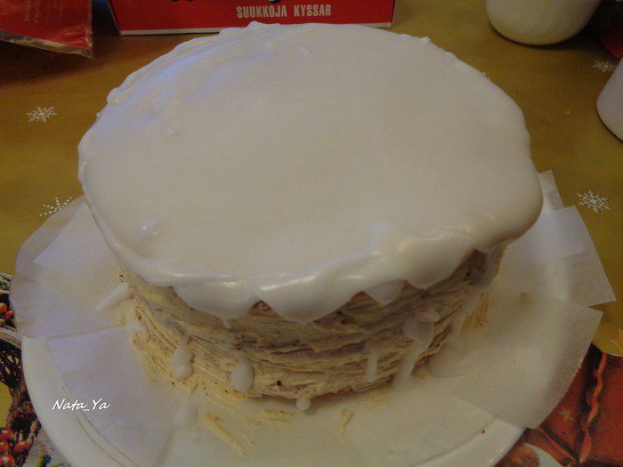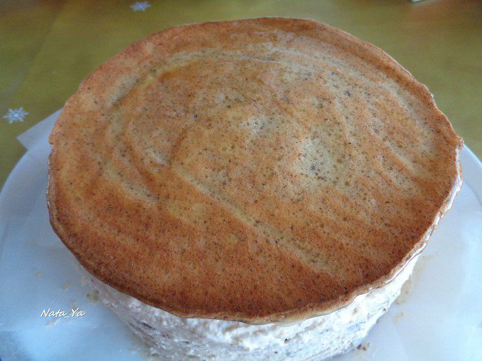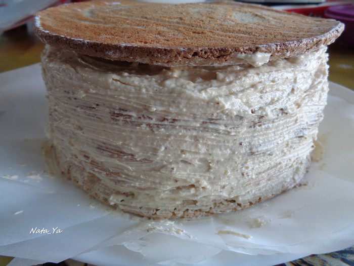 И так, пока не израсходуются все коржи и почти весь крем. Остатки крема пустить на бока торта. Я один корж запорола, поэтому у меня торт из 5-ти коржей. Но высокий все равно получился.