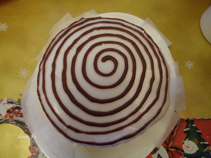 Затем провести по ним зубочисткой перпендикулярные линии от центра торта к краю и наоборот, каждый раз меняя направление на противоположное. Тут меня ждал конфуз. Дело в том, что помада очень быстро застыла, буквально мгновенно, хотя на водяной бане казалась жидкой. Поэтому, к сожалению, сделать красивую паутинку у меня не получилось. В следующий раз нужно будет больше ее развести и предварительно опробовать на чем-нибудь.