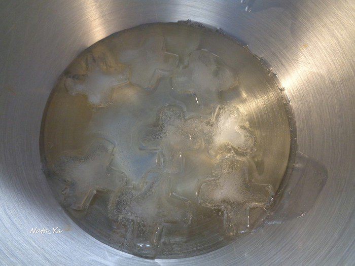 Кубики льда и миска у нас подготовлены. Выльем кипящий сироп в миску, в которой будем впоследствии взбивать. Сверху выложим кубики льда. Не нужно бояться, что сироп смешается с водой, этого не произойдет. Лед поможет равномерно остудить будущую помаду. Произойдет кристаллизация с образованием очень мелких кристаллов сахара, что нам и нужно.