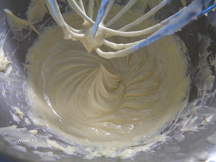 Переложите смесь в чашу миксера для взбивания. Когда она остынет до комнатной температуры, добавить несколько кубиков масла, взбить ручным или стационарным миксером на средней скорости. Добавлять масло по нескольку кусочков, каждый раз хорошо взбивая миксером до однородности.