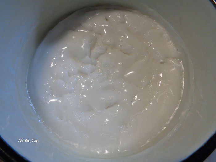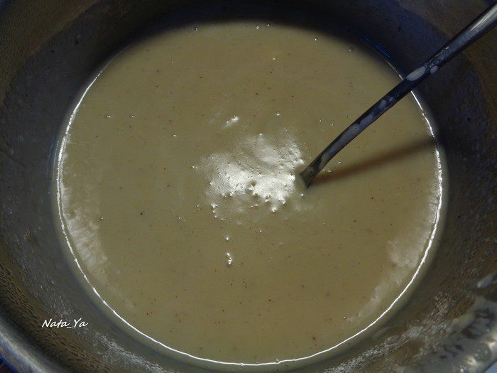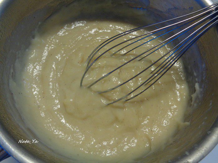 Переключить огонь на медленный. Постоянно взбивая венчиком, вылить в молоко мучную смесь. Уварить до загустения.
