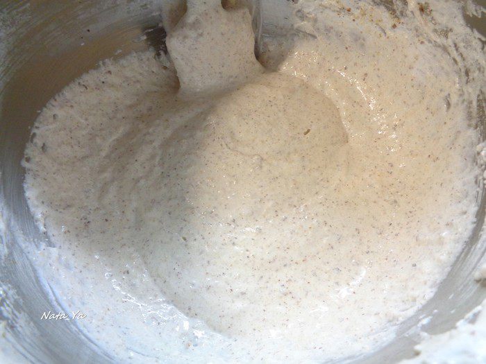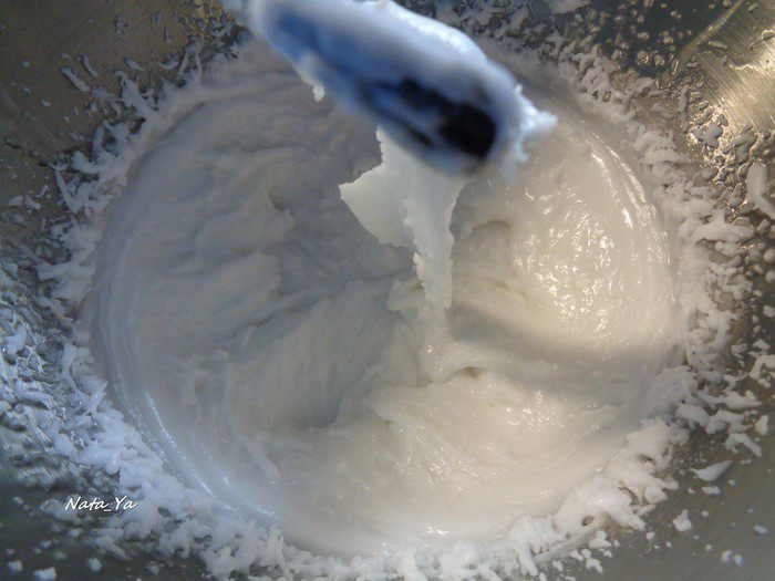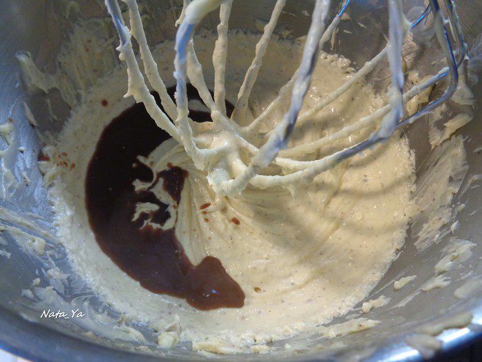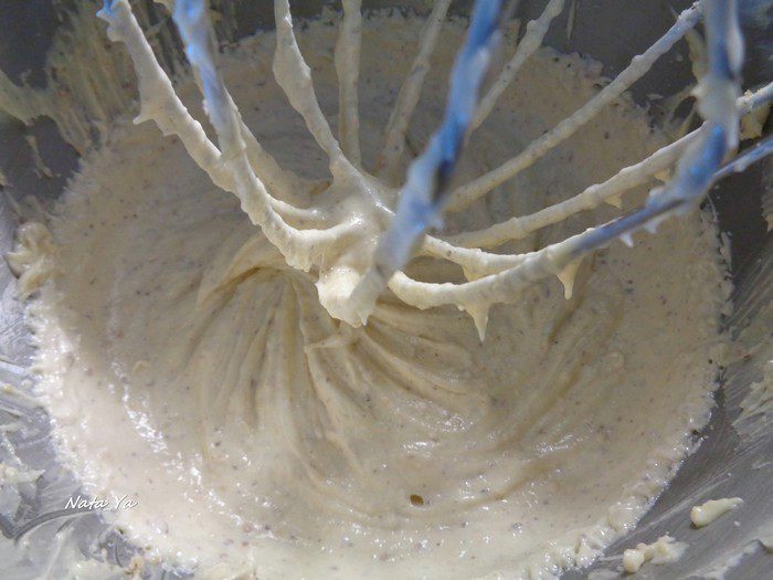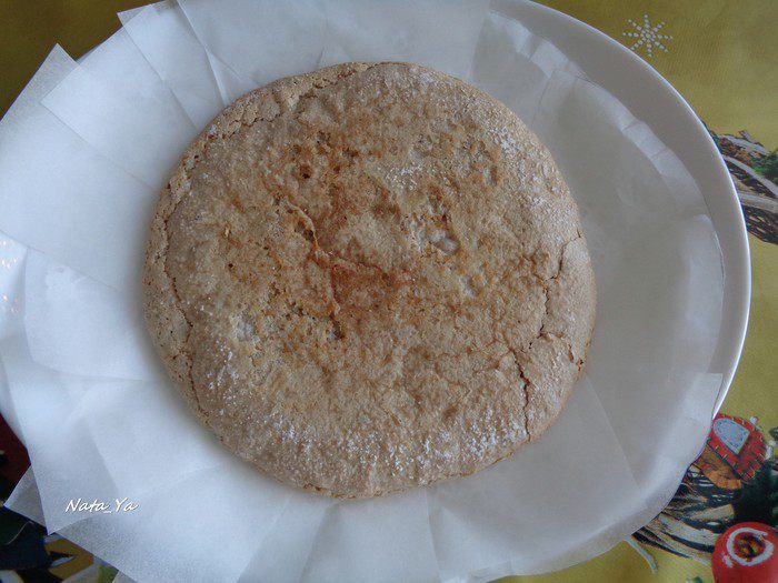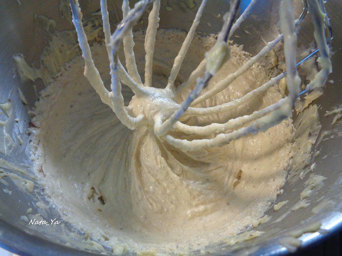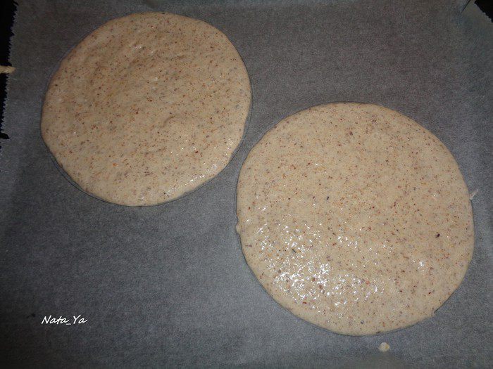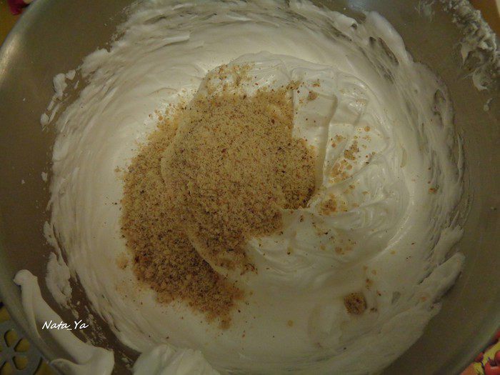 В 3-4 приема добавить ореховую муку, каждый раз аккуратно, но тщательно перемешивая по кругу и снизу вверх, не давая белкам опасть.