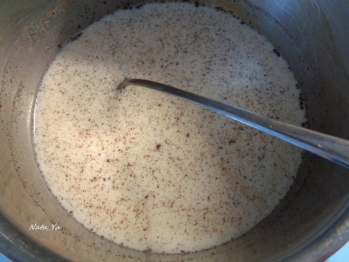 Оставшееся молоко вылить в сотейник, добавить сахар и ваниль, растворить и довести до кипения. Я использовала ванильный порошок. Если вы будете использовать ванильный стручок, то предварительно разрежьте его вдоль и достаньте семена ванили.