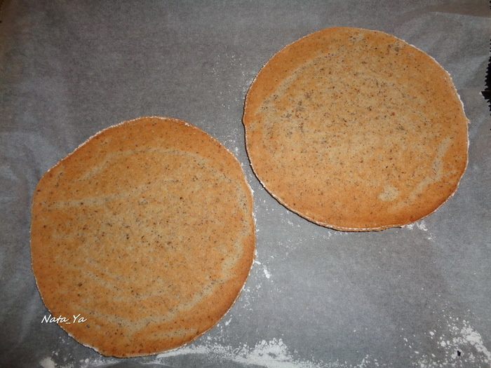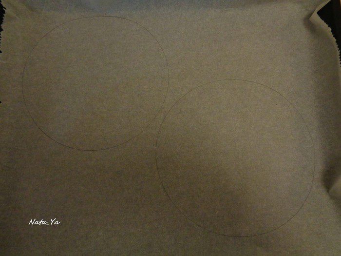 На пергаменте нарисовать по 2 трафарета, каждый диаметром 20 см. Всего из указанного количества теста должно получится 6 коржей.